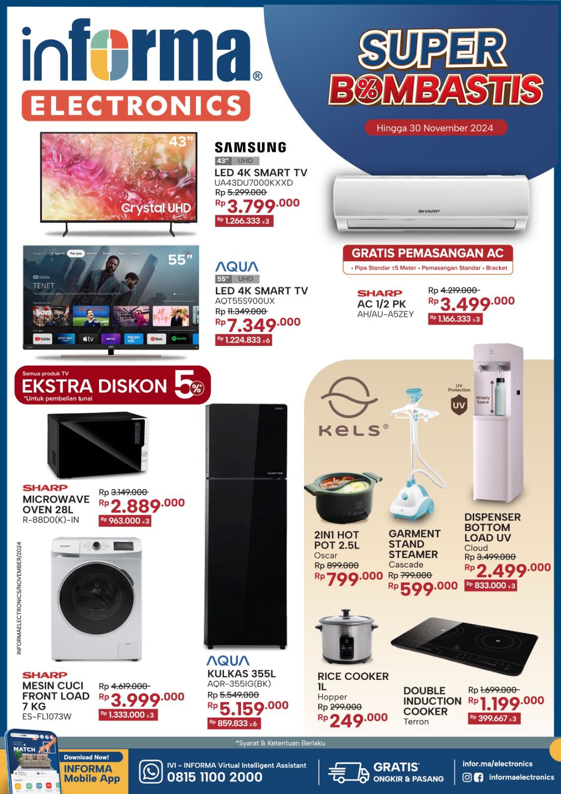 Promo “Super Bombastis” berlangsung hingga tanggal 30 November 2024. selain itu Informa Electronics juga menyelenggarakan “Late Night Sale” dengan konsep lelang produk elektronik mulai pukul 19.00 hingga 24.00 WIB. Keuntungan yang ditawarkan, antara lain: