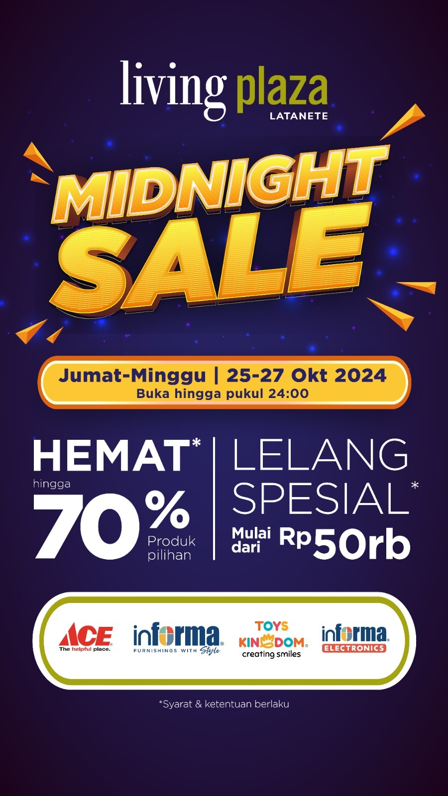 Jangan lewatkan promo menarik ini dan ajak keluarga serta teman-teman Anda untuk merasakan serunya Midnight Sale di Living Plaza Latanete. Catat tanggalnya, 25-27 Oktober 2024, dan temukan berbagai penawaran terbaik yang tidak boleh dilewatkan!